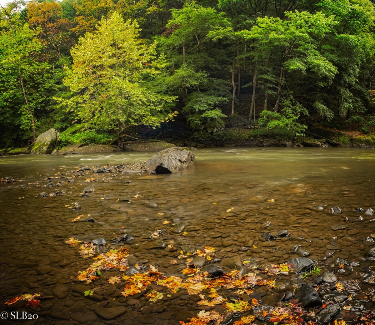 The day I went rain was in the forecast and I was hedging a bet that would keep folks away. I was largely right. I got to the park around sunrise and set off on one of my favorite trails. It meanders along Slippery Rock Creek and depending how high or low the water is, boulders appear or disappear. Since it’s been quite some time since I was on this trail, I took my time to explore all the little nooks and crannies against the stream and to my surprise and delight caught a glimpse of a baby river otter!! It started to drizzle as I started up the trail away from the stream and deeper into the forest, passing hardwoods and pines. Rain really started to come down and my rain jacket failed, I was soaking wet from inside out, I decided that before I got too cold to head back.
